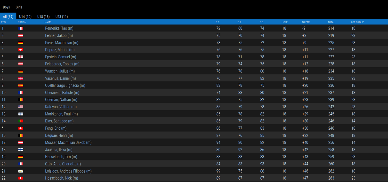 Seul en tête à l'issue du premier tour avec un score dans le PAR, il a enfoncé le clou lors de la deuxième journée, terminée sur le score de -4 ! Terminant T2 pour le compte de la dernière journée, Tao a remporté le tournoi toutes catégories confondues avec 5 coups d'avance sur son premier dauphin !